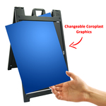 The Signicade Deluxe is the ultimate sidewalk advertising solution for those that need quick change graphics. The heavy-duty plastic sandwich board has two recessed 24x36 inch recessed graphic areas on the front and back. Coroplast mounted vinyl graphics slide easily into place for full-color signage, swap out these rigid signboard inserts as often as you need. Our graphics are full-color UV Direct Printed Coroplast for a long-lasting durable matte print.